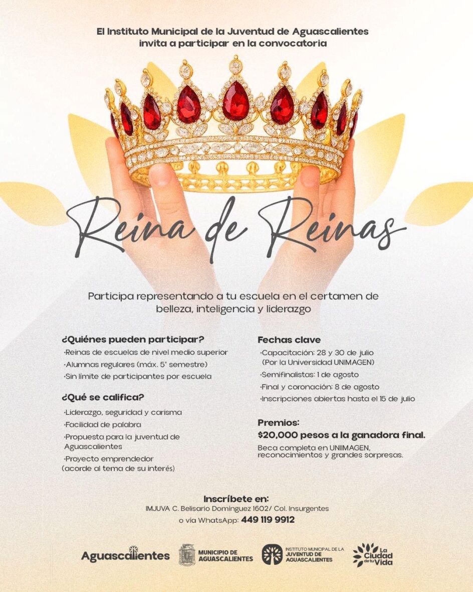 El Municipio de Aguascalientes, a través del Instituto Municipal de la Juventud (Imjuva), convoca a todas las estudiantes de nivel medio superior a participar en el certamen “Reina de Reinas”, una iniciativa que busca reconocer y proyectar a jóvenes destacadas por su inteligencia, liderazgo y compromiso social.