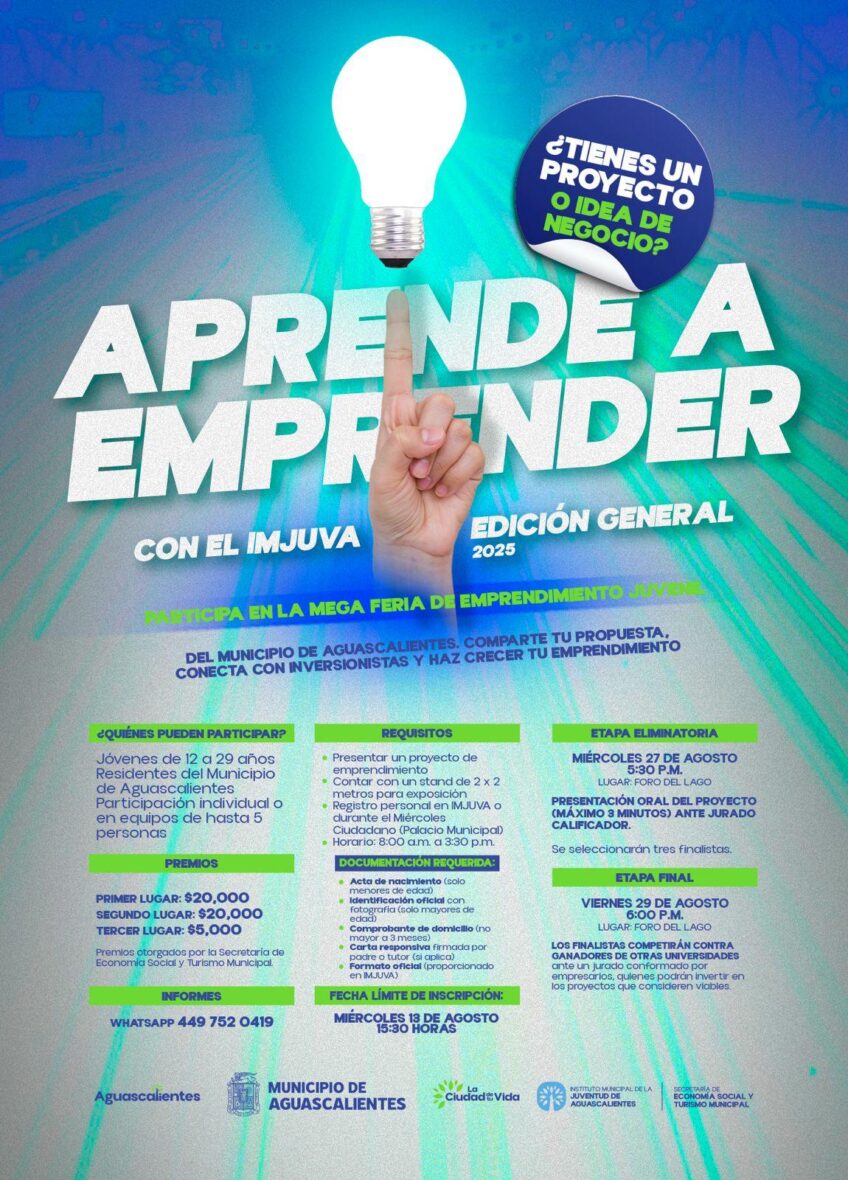 El Municipio de Aguascalientes, a través del Instituto Municipal de la Juventud, invita a las y los jóvenes a participar en la convocatoria “Aprende a Emprender”, una iniciativa que reafirma el compromiso con el emprendimiento como una herramienta fundamental para el desarrollo de la juventud.