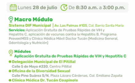 º La cita este próximo 28 de julio en diversos puntos de la ciudad como el DIF Municipal y la Delegación de El Pitillal de 8:30 am a 3:00 pm Wendy Díaz Puerto Vallarta Con motivo del Día Mundial contra la Hepatitis, que se conmemora el próximo 28 de julio, la...