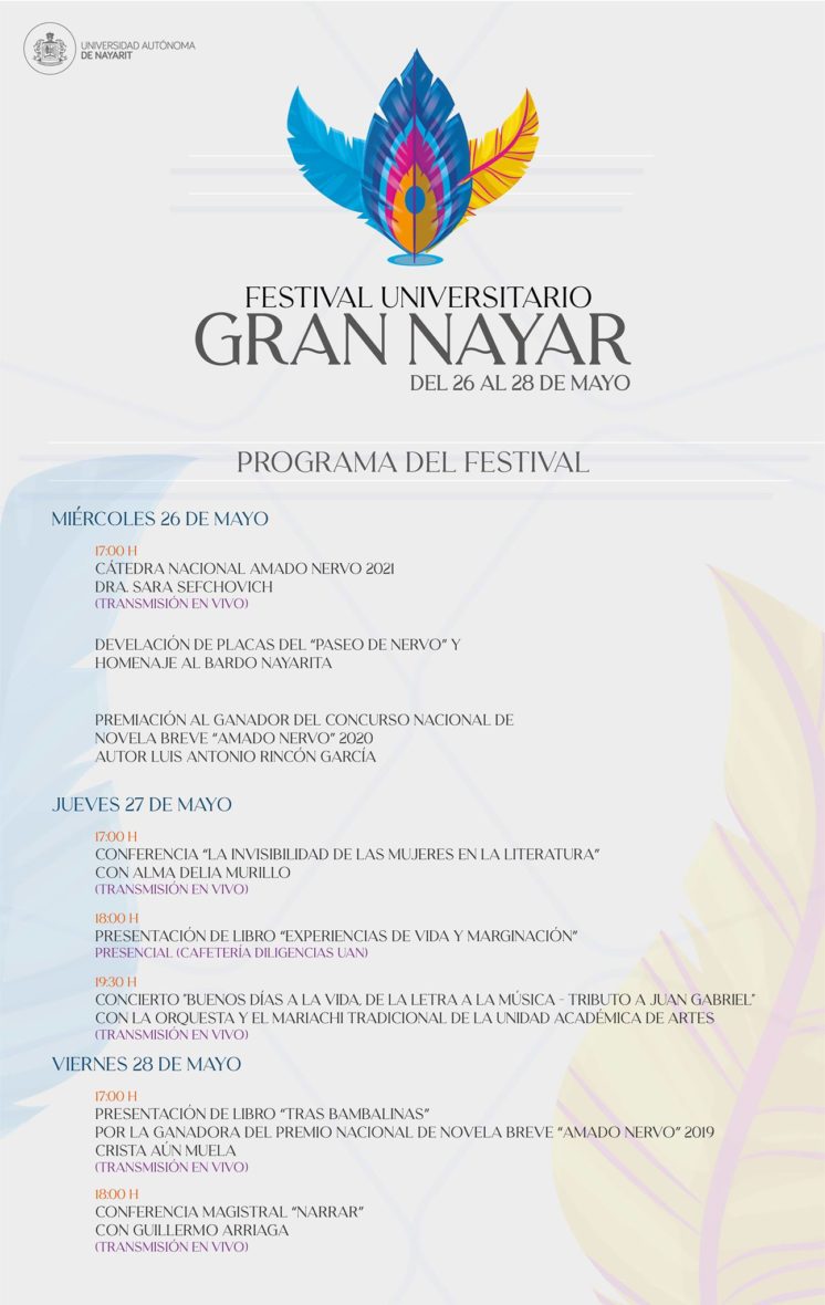 La Universidad Autónoma de Nayarit (UAN) a través de la Secretaría de Extensión y Vinculación (SEV), llevarán a cabo el Festival Universitario Gran Nayar 2021, del 26 al 28 de mayo, el cual contará con una doble modalidad siendo virtual y presencial, con el objetivo de ser un espacio intercultural de encuentro, reconocimiento y diálogo de saberes entre los pueblos de la región con el mundo.
