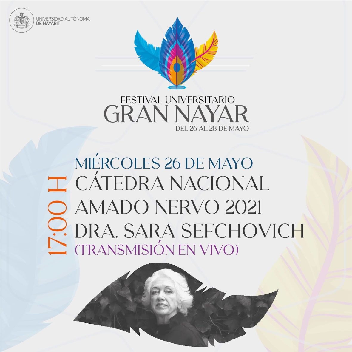 De esta forma, el evento tendrá dentro de su programa, el 26 de mayo la Cátedra Nacional Amado Nervo 2021, a las 5 de la tarde a través de la modalidad virtual, a cargo de Sara Sefchovich socióloga, historiadora, escritora, catedrática, investigadora, traductora, comentarista y conferencista mexicana, autora de catorce libros y múltiples artículos en periódicos y revistas.